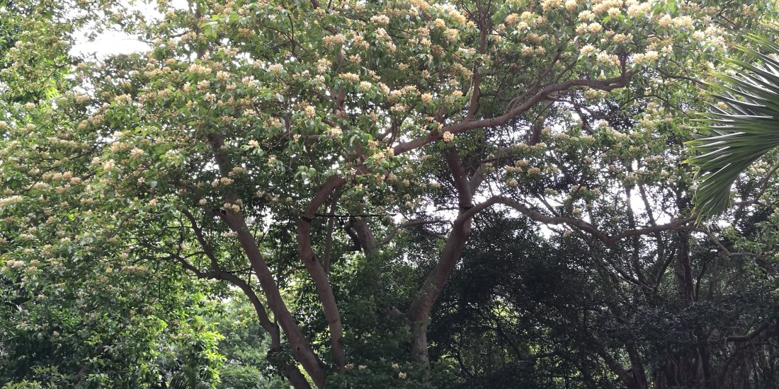 The girth of the trunk is impressive and its crown, in full bloom (7 May), is glamorous with its yellow and white flowers.