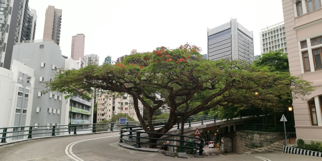 This is one of my favourite Flame trees in Hong Kong, being located inside a roundabout ramp inside the University of Hong Kong. The shape of the road helps to accentuate the slender body and wide canopy that is typical of the Flame tree.