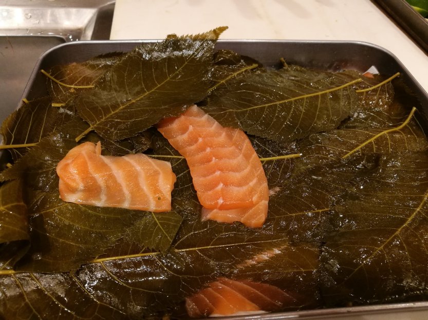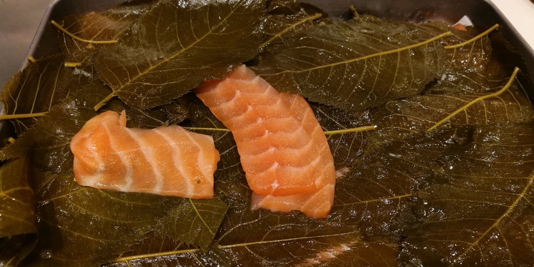 Pieces of salmon are placed between beds of sakura leaves and left in the fridge. to serve it, the piece of salmon is placed expertly on sushi rice. To complete the ensemble, a piece of the leave is cut into a strip and served on top of the fish.