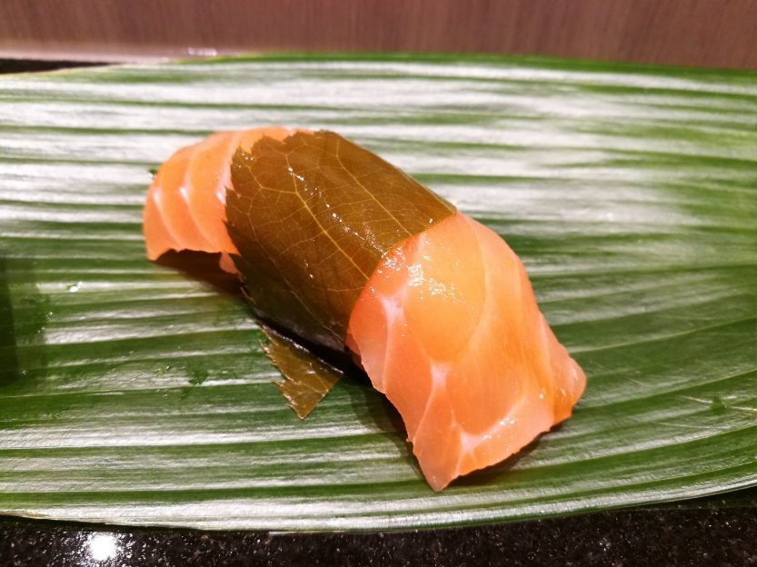 Our chef at Tsukiji Aozora Sandaimei has managed to combine the two into a single recipe that uses the leaves of the sakura tree as a part of the marinade for salmon.