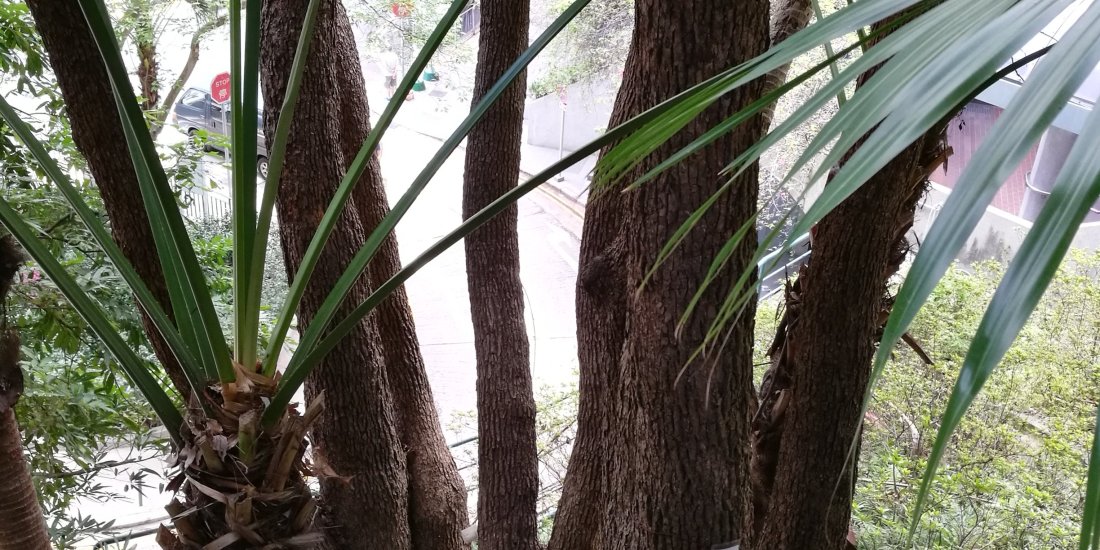 After your meeting with this family, it is time to head back to the main stairs and continue up, by the elevator, to the next level, and then up a path to the Chong Yuet Ming Amenities Centre. From here you can see a whole community of Camphors growing on the slope between the buildings. They are not massive or old, like those bordering Kowloon Park, but they are full of vitality and are thriving in their protected enclosure, left to their own devices. For a full view of the whole community, turn around as you get to the Amenities Centre and look through the window back down over the slope.