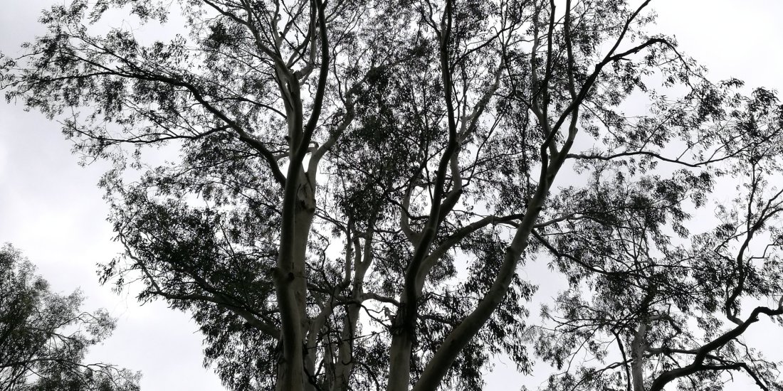 The tree’s main trunk’s considerable girth occupies most of the albeit narrow sidewalk. Customary of the Eucalyptus genus, the trunk near the ground features flaking brown bark but higher up, the trunk is encrusted with a limestone grey skin that resembles painted plaster.
