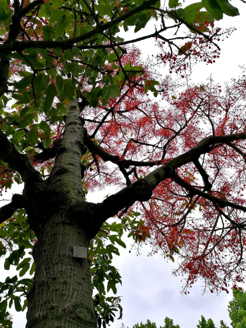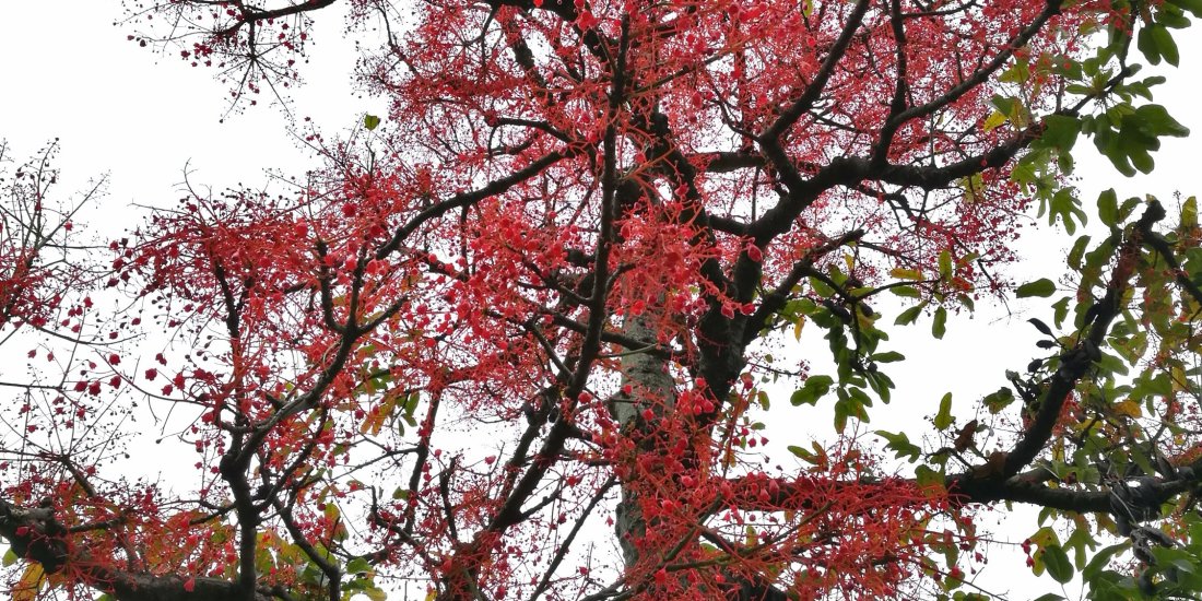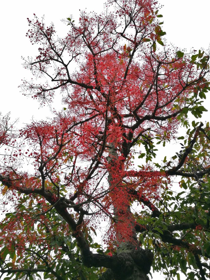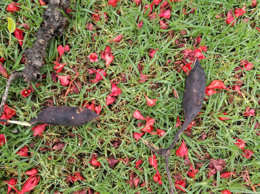 But it is easy to understand why it shares its namesake with the delonix. When in bloom, the flowers burst forth to cover much of the tree’s limbs, setting it ablaze in a sea of bright red flowers.