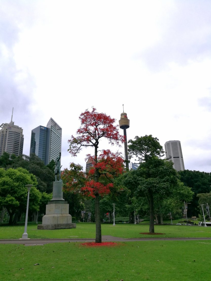 Just as I was enraptured by the purple haze of Sydney’s jacarandas, I was treated to an eyeful of red flowers on a lonely tree on a path in the city’s Hyde Park.