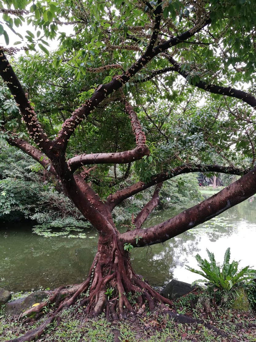 Although this individual, standing next to the ecological pond of the park, was less dramatic since it’s not hanging off a wall, it was no less striking because it was at the height of its fruiting season. Tiny pink and green fruits dot its limbs like sequins.