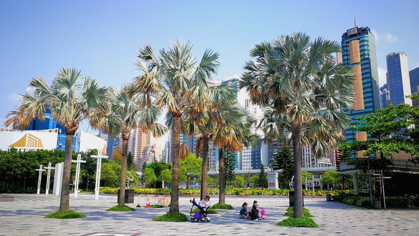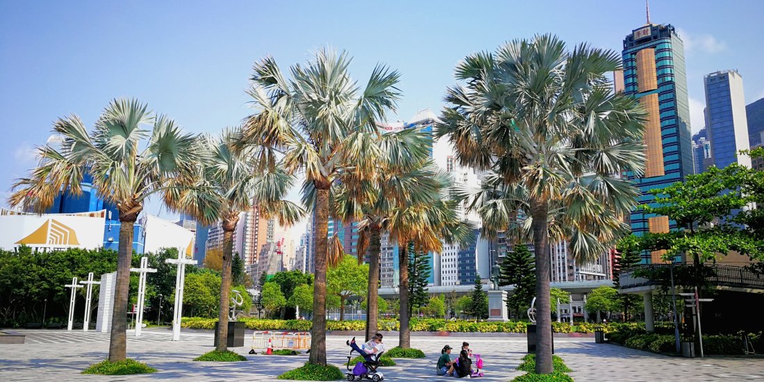 There are many different species of palm trees in Hong Kong, but the most prominent and easiest to find is the Chinese Fan Palm (livistona chinensis) It is distinguishable by its thick and robust trunks and large fan-like leaves, which resemble large round sheets with sword-like extensions protruding from the edges.