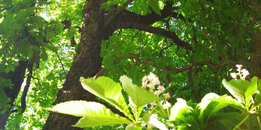On this trip, the Horse Chestnut, with their broad teardrop-shaped leaves, were all lush and green, maay spouting pyramid formations of white flowers.