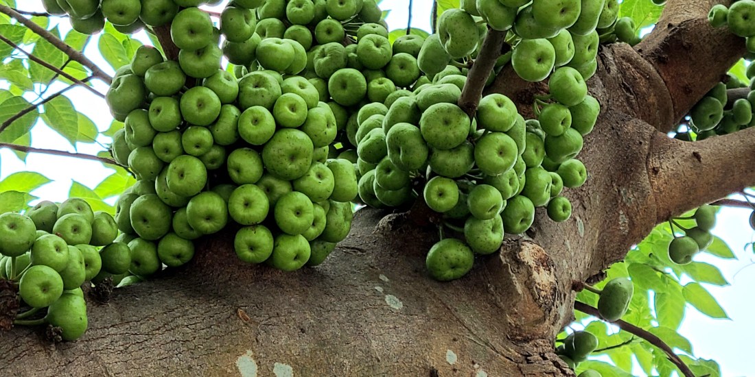 A couple of Red-stemmed Fig (ficus variegata) trees bearing a hoard of fruit.